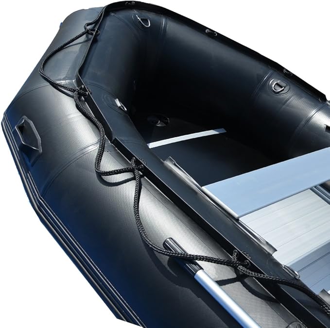 - Features: durable marine plywood transom for outboard motor, double layers of fabric at the bottom of the tubes This allows 2.4mm of lower tube protection from sharp rocks and abrasive sands. deep V-keel with rub-strake protection for easy planing . three individual chambers, one-way drain valve with plug, built-in oarlock for easy rowing, transom stainless "D" lifting rings, nine interior tie down stainless steel D-ring on tubes, two large tow stainless steel D-rings on bow and rear tubes