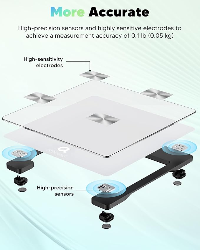 - Advanced BIA Technology for Deeper Insights: Equipped with BIA technology, 4 high-sensitivity electrodes, and 4 high-precision sensors, the Arboleaf smart scale delivers accurate, consistent readings of weight, body fat, muscle mass, and more—down to 0.1 lb / 0.05 kg