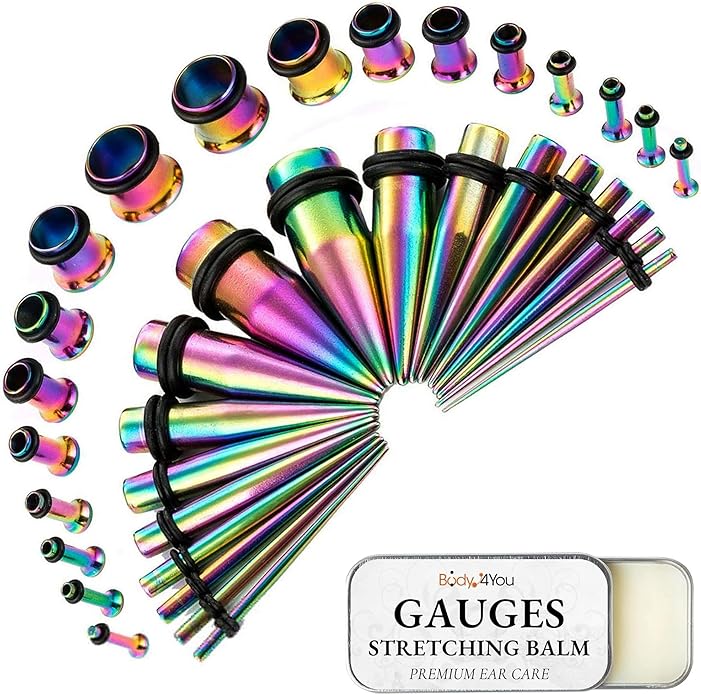 - COMPLETE GAUGING SET: Start Ear Stretching Journey with 37-piece Kit, Featuring Surgical Stainless Steel Tapers and Single Flare Tunnels with Secure O-rings. Begin with 14G (1.6mm) and Gradually Size Up to 00G (10mm). Natural Stretching Balm for Smooth and Comfortable Gauging Included - Make Sizing Up Easy, Safe and Comfortable