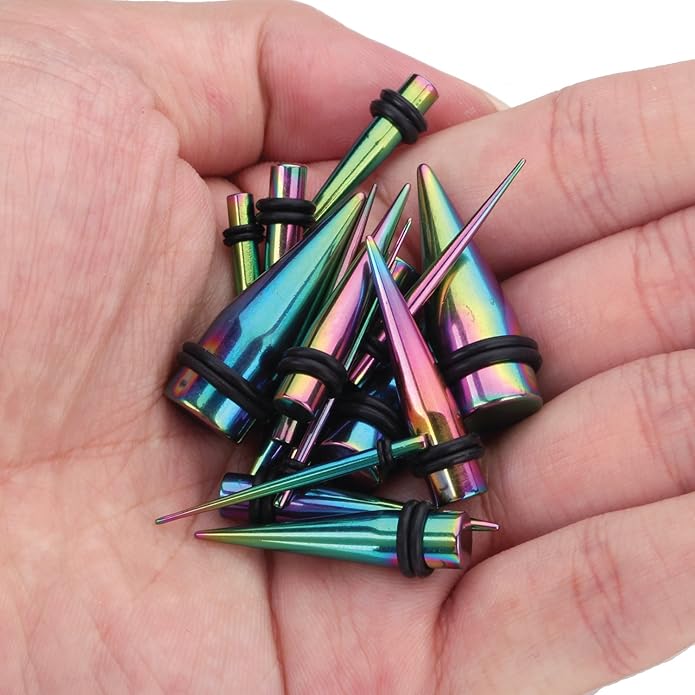 - VERIFIED SIZES: Tunnels, Tapers (O-Rings Included): 14G (1.6mm), 12G (2mm), 10G (2.4mm), 8G (3.2mm), 6G (4mm), 4G (5mm), 2G (6mm), 0G (8mm), 00G (10mm). COLOR: Rainbow. SINGLE FLARE: Plug Has Lip on One Side and Perfectly Smooth on Other, O-Rings Will Securely Hold Jewelry in Your Ear