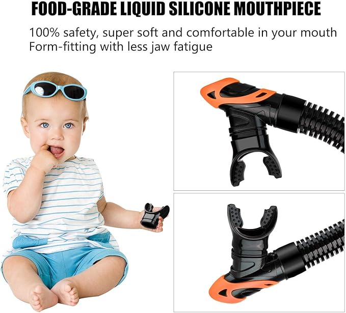 - Advanced Dry Valve and Splash Guard: The innovative dry top valve automatically seals when submerged, effectively blocking water entry. The splash guard further protects against waves, while the advanced design prevents clogging from sand or debris, ensuring consistent and comfortable breathing.