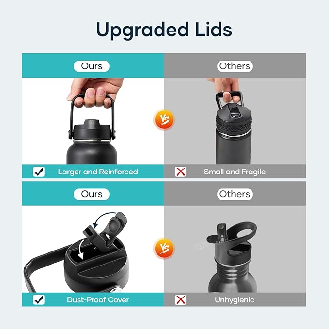 - 2 Caps Pack: This 40 oz stainless steel water bottle comes with straw lid and flex cap, the flex cap is perfect for the beach, camping and hiking, while the straw lid is suitable for cycling and road trip