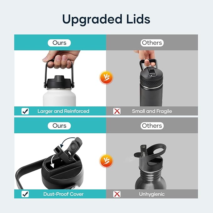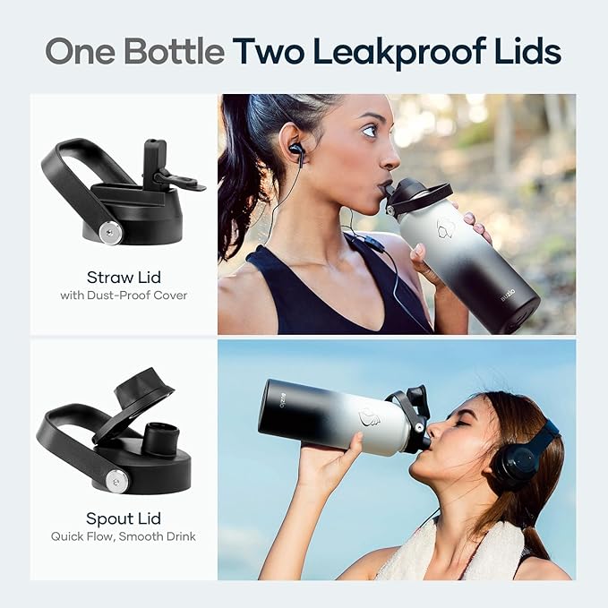 - 2 Lids to Max Its Usability: This stainless steel bottle comes with a straw lid and a flex cap to gear up your games and explorations. Both caps can seal airtight with 100% leak-proof, so you can drink without a spill on the road. *NOTE: ONLY the 22oz and 32oz T-shape bottles fit in any cup-holders*