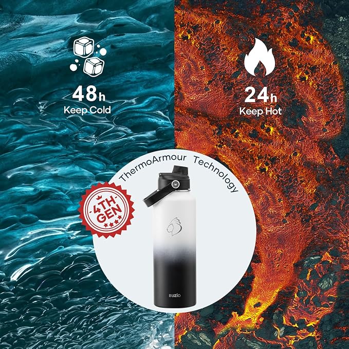 - Fresh Kept Longer: BUZIO stainless steel bottle features unique ThermoArmour technology that keeps beverage cold for up to 48 hours and hot 24 hours, making sure your every sip is refreshingly icy.