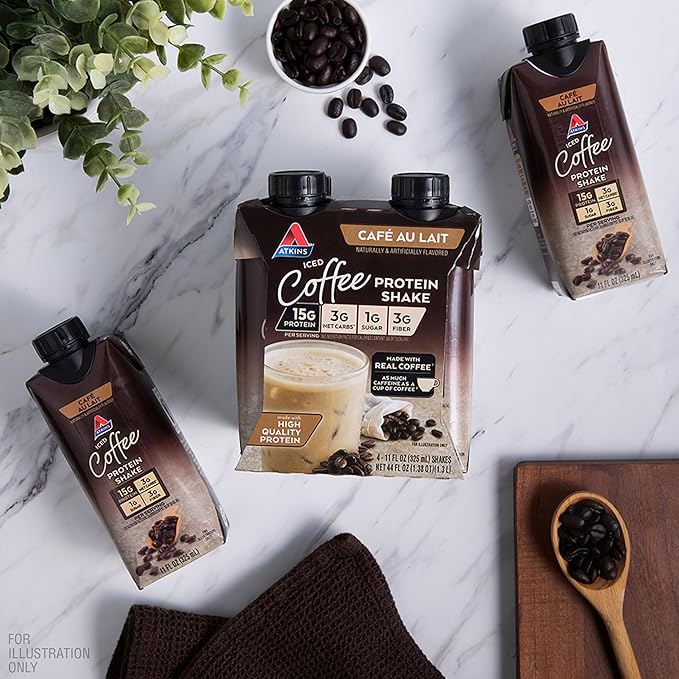 Atkins Café au Lait Iced Coffee Flavored Protein Shake, High Protein Shake, Low Sugar, Low Carb and Low Sugar, Keto Friendly, Gluten Free, 12 Count