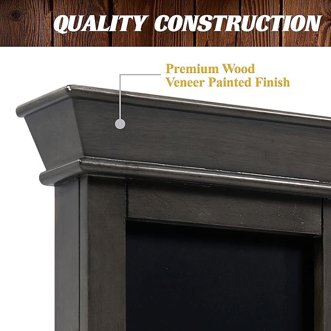 - CRAFTSMANSHIP: The cabinet display is black flannelette cloth lined and made of MDF with a painted wood veneer finish and provides 41.375” x 23.6” of wall protection, LED lights are powered by 4, AA batteries (not included).