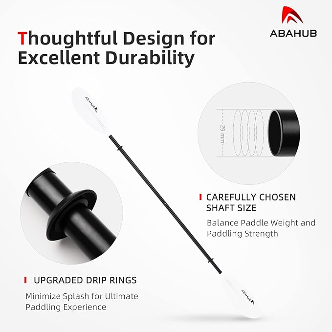 • MADE to LAST: Made of premium quality 1.15mm thick, 29mm diameter aluminum alloy shaft, and fiberglass reinforced polypropylene blades, total weighs 38oz (1075g). This kayak paddle is impact and erosion resistent, thus for great durability. Itโ€™s perfect for beginner and intermediate kayakers.