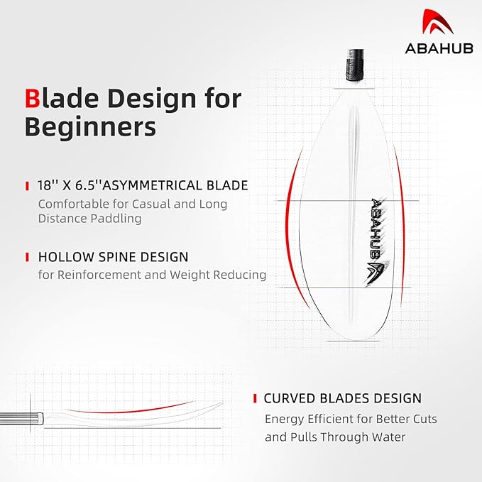 - ENERGY EFFICIENT BLADE DESIGN: With 18'' x 6.5''Asymmetrical blades, this paddle is comfortable and energy saving, both for casual and long distance paddling. The blades are feathered with a hollow spine for reinforcement and less weight. All these add up to better cuts and pulls through water.