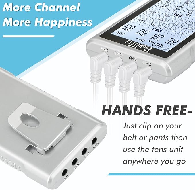 Belifu 4 Independent Channel TENS EMS Unit, 24 Modes,30 Level Intensity Muscle Stimulator Machine, Rechargeable Electric Pulse Massager with 10 Pads&5 Set Leads Wires, for Pain Relief Therapy (Silver)