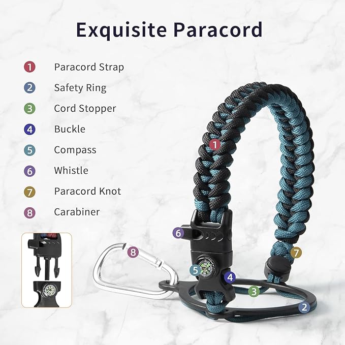 • Full-function Paracord Handle: Brilliant paracord of matching colors bring out the bottle with a touch of youthful vibe. Compact compass and handy carabiner make the bottle the ideal survival kit for expeditions in the wild.
