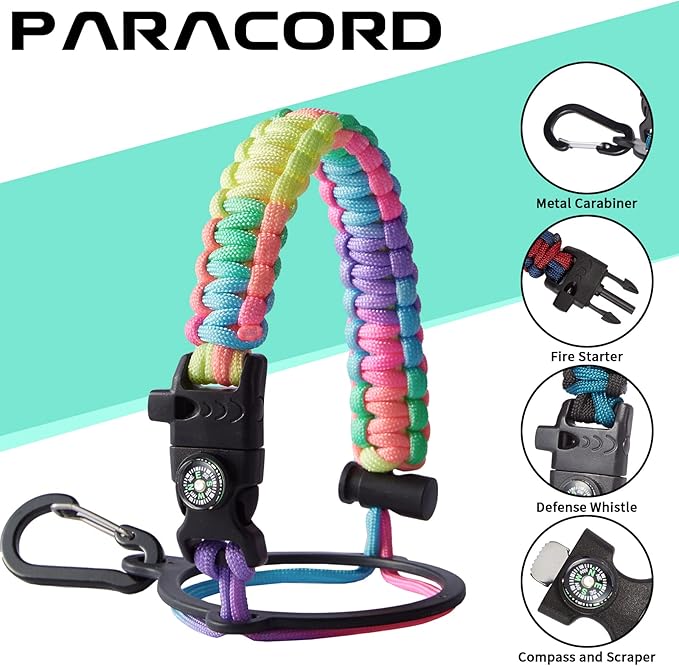- UNIQUE PARACORD—Perfect Accessories: bright color paracord matches the flask water bottle to give you a youthful vibe while adding a personal style. It comes with a compass, safety loop, metal carabiner, flint, igniter, and whistle to become your survival tool for your wild adventures