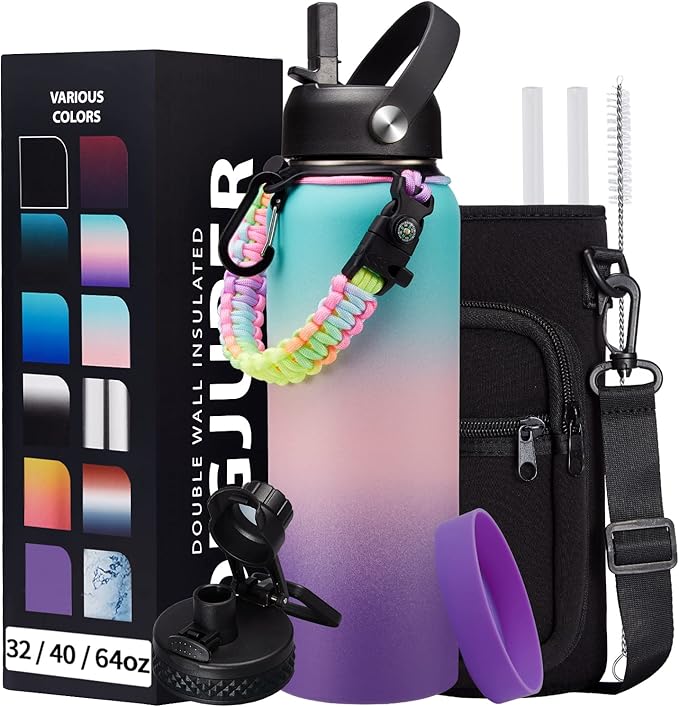 - COMBO—Super Deal: Buy 40oz stainless steel water bottles and get 9 accessories (2 x lids, 1 x survival paracord, 1 x carrying pouch, 1 x shoulder strap, 1 x protective cup mat, 2 x straws, 1 x straw brush). WITH A LIFETIME GUARANTEE, these thermal water bottles are the perfect gift for use at home, work, school, road trips, hiking, sporting events, or just hanging out