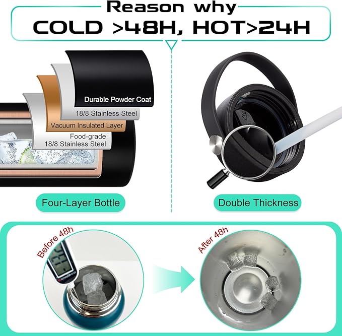 - TRIPLE-INSULATION & HIGH-PERFORMANCE: This wide mouth 1/2 gallon water bottle features triple-wall vacuum insulation and pro-grade stainless steel, it keep-cold for 48 hrs and keep-warm for 24 hrs without altering the taste and keeps your water tasting fresh. Using this metal water bottle on hot summer days or your next camping trip to stay hydrated all the day
