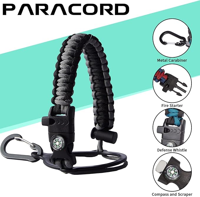 - UNIQUE DESIGNS PARACORD HANDLE: Full-function paracord handle made in individual styles to match the color of the flask water bottles. With compass, safety ring, carabiner, flint fire starter & whistle. It unravels into a sturdy and taut rope in an emergency, making the large water jug an ideal survival kit for expeditions in the wild