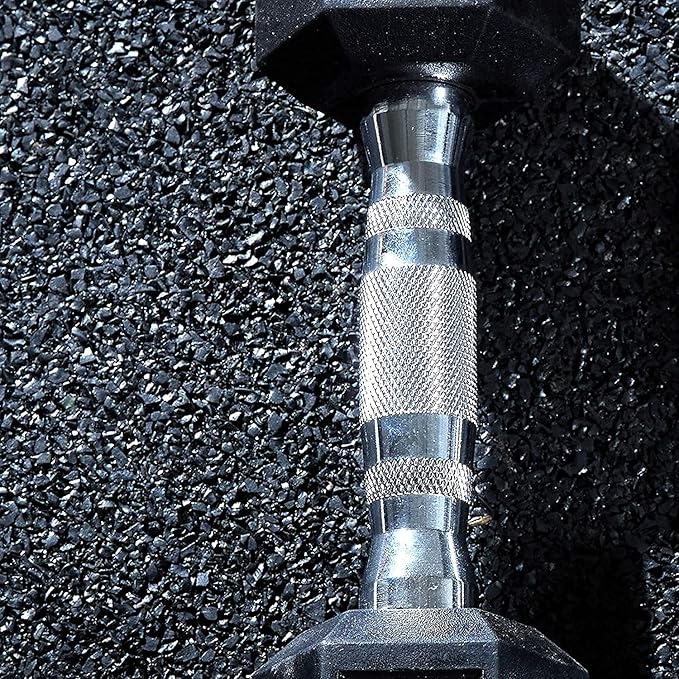 - ?‘Š Rubber Hexagon Shaped with Rubber Grip Handle - Rubber hexagon shaped head prevent rolling, protect your floor and keep the dumbbells stay in place; the rubber grip with depth knurling contoured handle provides essential grip and security during use.
