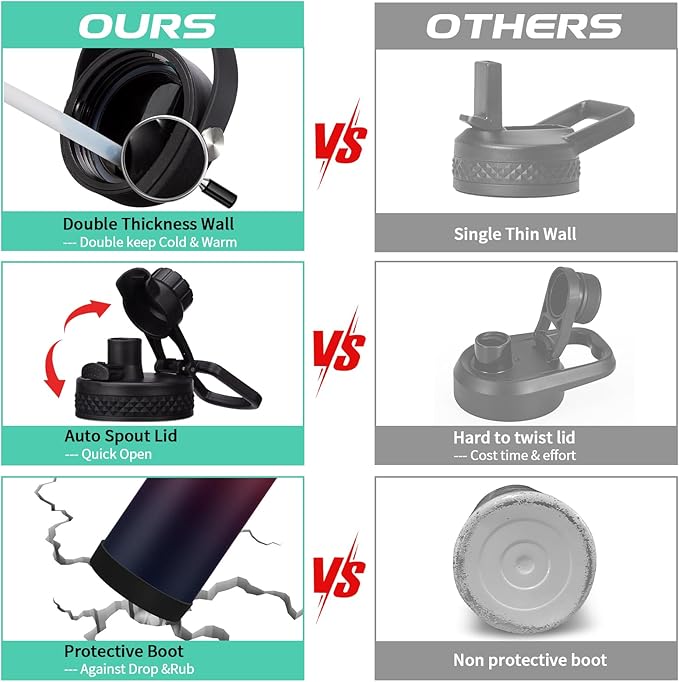 - 2 LIDS—100% Leak Proof: the auto spout cap & straw lid provide your different drinking experience. The ONE-HAND operation pop-up spout lid for convenient enjoy your fast water flow. The SPILL-PROOF straw lid with high flow rate & BPA free. Both 2 lids design with a sturdy handle, making the insulated water bottle more convenient to carry