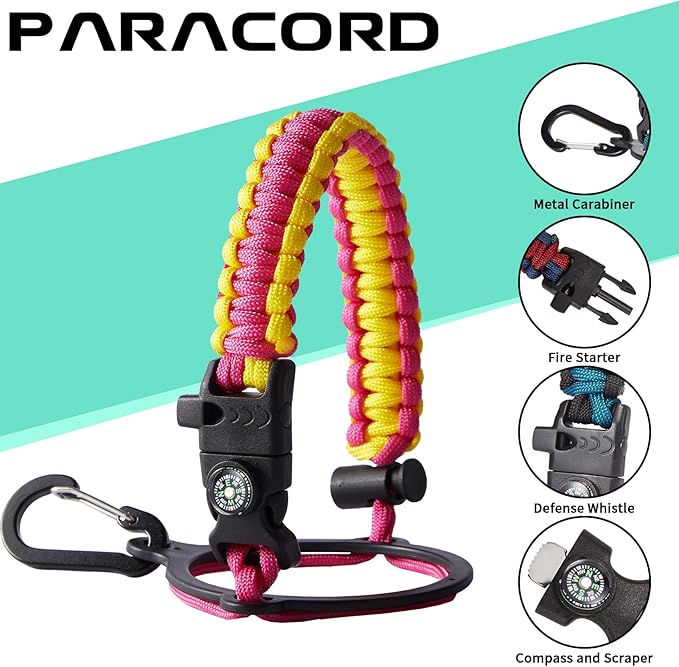 - UNIQUE PARACORD—Perfect Accessories: bright color paracord matches the flask water bottle to give you a youthful vibe while adding a personal style. It comes with a compass, safety loop, metal carabiner, flint, igniter, and whistle to become your survival tool for your wild adventures