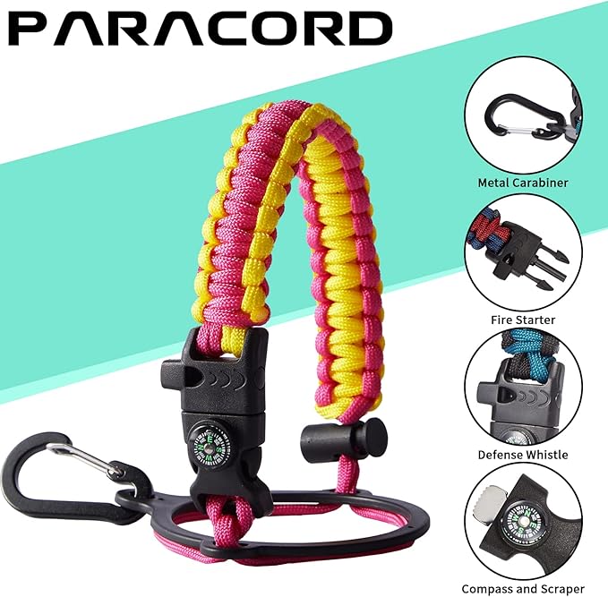 - UNIQUE PARACORD HANDLE: Bright color paracord matches the flask water bottle to give you a youthful vibe while adding a personal style. With a compass, safety loop, metal carabiner, flint, igniter and whistle to become your survival tool, making the 32 oz stainless steel water bottle with paracord an ideal survival kit for expeditions in the wild