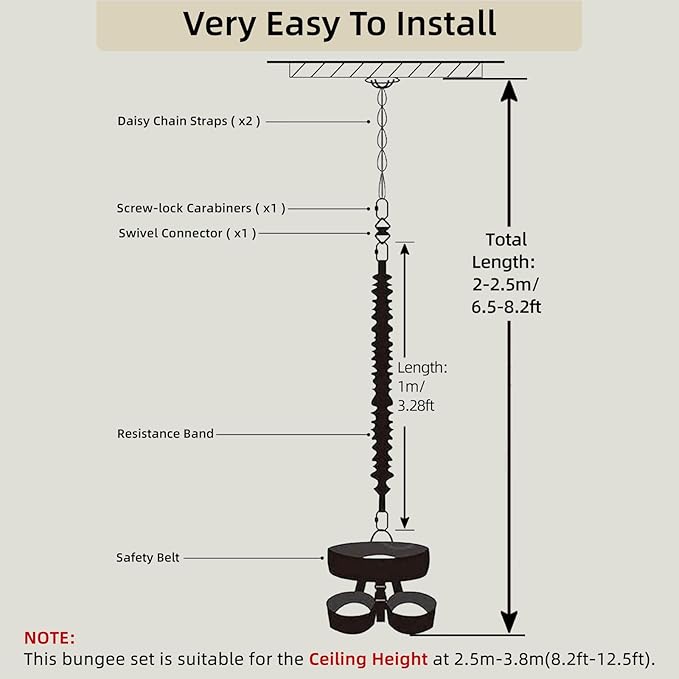 - 【6 Sizes for Choosin】Our elastic rope fitness setup comes in multiple resistance levels, with an adjustable safety harness designed for all body types: XS: 88–110 lbs S: 110–132 lbs M: 132–154 lbs L: 154–176 lbs XL: 176–198 lbs XXL: 198–220 lbs Note: Suitable for ceilings/floors 2.5–3.8m (8.2–12.5 ft) in height