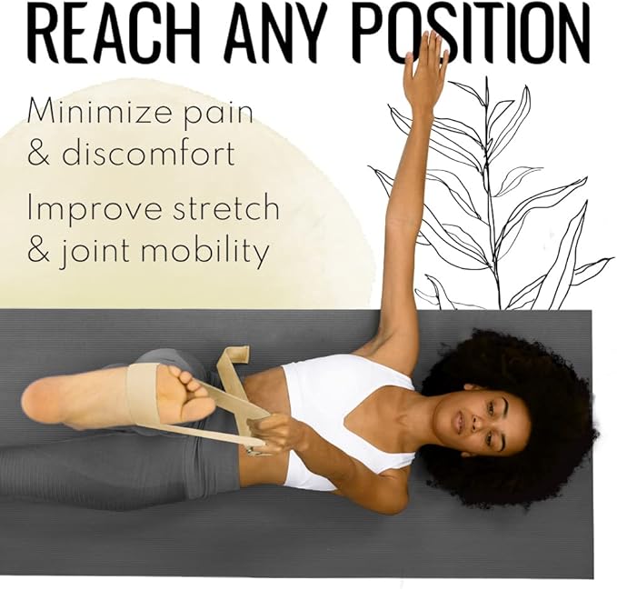 • 2-IN-1 YOGA BELT. Color: BEIGE. Length: 8 FT. Width: 1.5 IN. Material: Cotton Blend. Non-elastic. Superior Non-slip Grip.