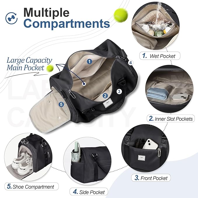 • ๐–๐ž๐ญ ๐๐จ๐œ๐ค๐ž๐ญ & ๐’๐ก๐จ๐ž ๐‚๐จ๐ฆ๐ฉ๐š๐ซ๐ญ๐ฆ๐ž๐ง๐ญ: The wet pocket is perfect for storing sweaty clothes or towels after your workout; The shoe compartment allows you to easily store and access your gym shoes without dirtying the main compartment