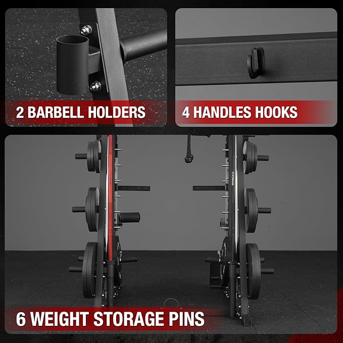 - [Home Gym System Design] Equipped with individual dual pulley systems, the M4 Smith Machine is an ultimate training station for your home gym, which means you can do superset with it and training together with your family and friends. Stop wasting your time cleaning up the messed up floor, M4 comes with great storage capacity that keeps your home gym organized. (Storage Racks with 6 weight plate pins and 2 barbell holders)