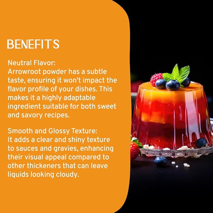 - VERSATILE ARROWROOT POWDER - Unleash Arrowroot powder's culinary versatility with ease! Thicken sauces and soups effortlessly, bake gluten-free treats for delightful textures, create crispy coatings with your favorite flavorsand craft glossy glazes and luscious dessert fillings. Elevate your culinary creations with this indispensable kitchen staple!