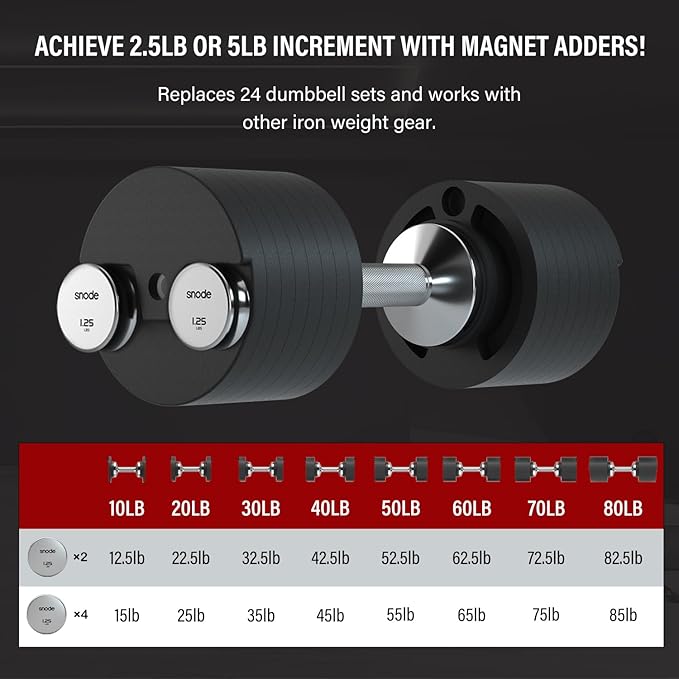 - 【Adjust weights in seconds】Turn the dial to adjust the weight. 8 weights set in one dumbbell, weight selection: 10, 20, 30, 40, 50, 60, 70, 80 lbs. SNODE Adjustable Dumbbells is to adjust the weight on both sides of the dumbbell at the same time.