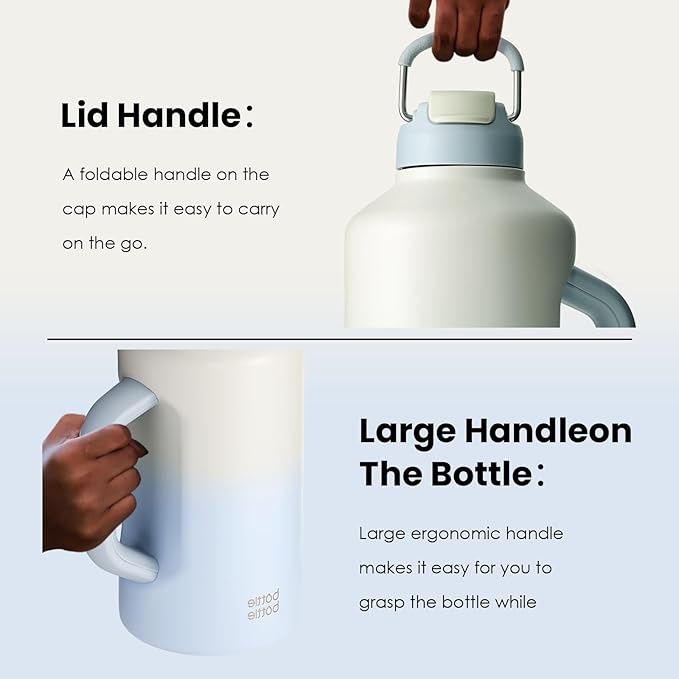 - Large Handle and Cap Carrying Handle:The water bottle has a large handle, easy to grasp the drinking water; the cap has a small carrying handle, more convenient to carry outside