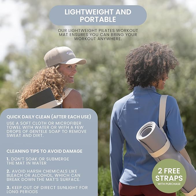 - EFFORTLESSLY PORTABLE: Our lightweight pilates workout mat ensures you can bring your workout anywhere. Included with your purchase are 2 storage straps, making transport and storage a breeze, for fitness that follows you