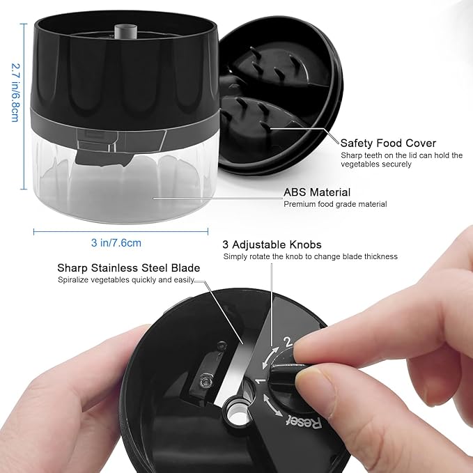 - [HIGH QUALITY MATERIALS]-The blade of spiralizer is made of high quality stainless steel. Due to its compact size, it takes up minimal space and fits comfortably in the hand for precise and safe cutting.