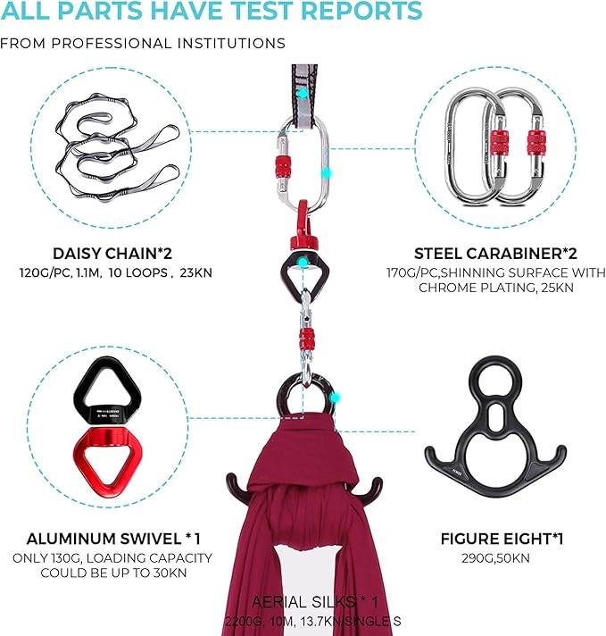 - SILK STYLE - This aerial silk products are made of high-quality materials and well-designed to ensure safety. Our Aerial Silks Kit have undergone strict testing and certification to ensure that there are no safety hazards during use. At the same time, we provide detailed instructions and operation videos to make you feel more at ease when using them.