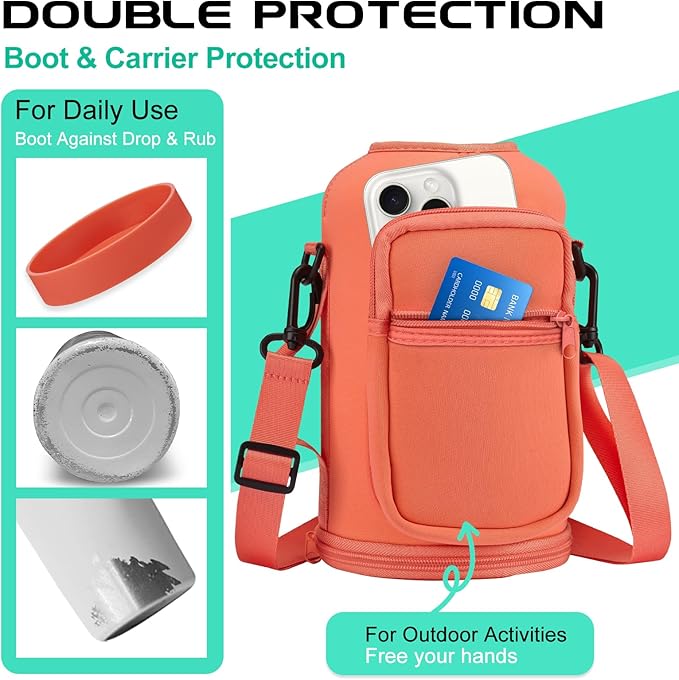 - PROTECTIVE BOOTS & STORAGE SLEEVE: Upgraded silicone boots prevent shattering and cracking when stainless steel water bottle accidental dropped. And storage carrying pouch with removable shoulder strap for convenient hands free carrying! The safe zippered pocket design to stores all your stuff, holds your cards & phone & key