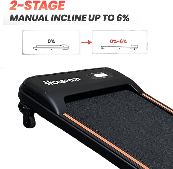 - [Adjustable Incline] Boost your exercise routine with this compact treadmill, offering a convenient 6% manual incline adjustment. Even during office hours, this incline adds a level of intensity to your walk, helping to make your workout more engaging and effective.