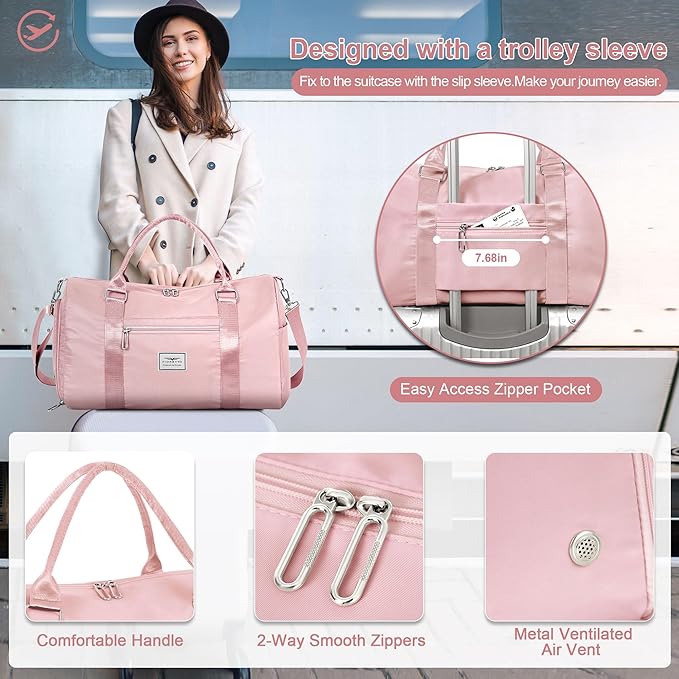 FIORETTO Womens Gym Tote Duffle Bag with Toiletry Bag, Sports Duffel Overnight Hospital Workout Carry on for Girls with Wet Pocket & Shoe Compartment, Ideal for Travel, Swimming, Dance Pink