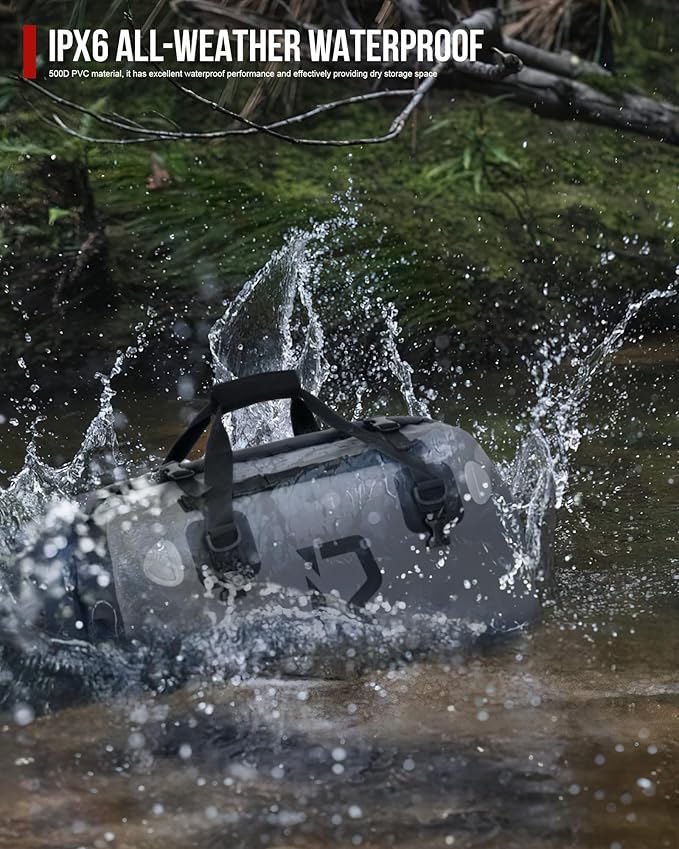 - 【Excellent waterproof property】Made with high-quality 500D PVC material, this bag features seamless sealing welding and a roll-top design that ensures complete protection against heavy rain. The Velcro closure at the top makes it easy to roll up and access your items quickly. This fabric withstands extreme temperatures, humidity, and UV exposure without cracking or deteriorating, making it perfect for long-distance travel. Your belongings will stay dry in any weather.