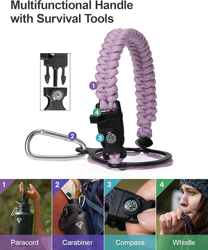 - Ready for adventures: The paracord handle is crafted from sturdy braided rope with an attached survival kit. This includes a compass, a whistle, and a clip, making it an ideal companion for any outdoor activity β be it camping,hiking or exploring new places through travelling.