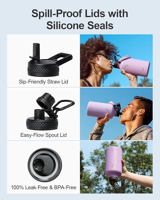 - No Leaks, No Worries: This stainless steel water bottle ncludes two leak-proof lidsβa straw lid and a spout lid. Both are equipped with silicone rings to prevent any spills or leaks, and are completely BPA-free for your peace of mind.