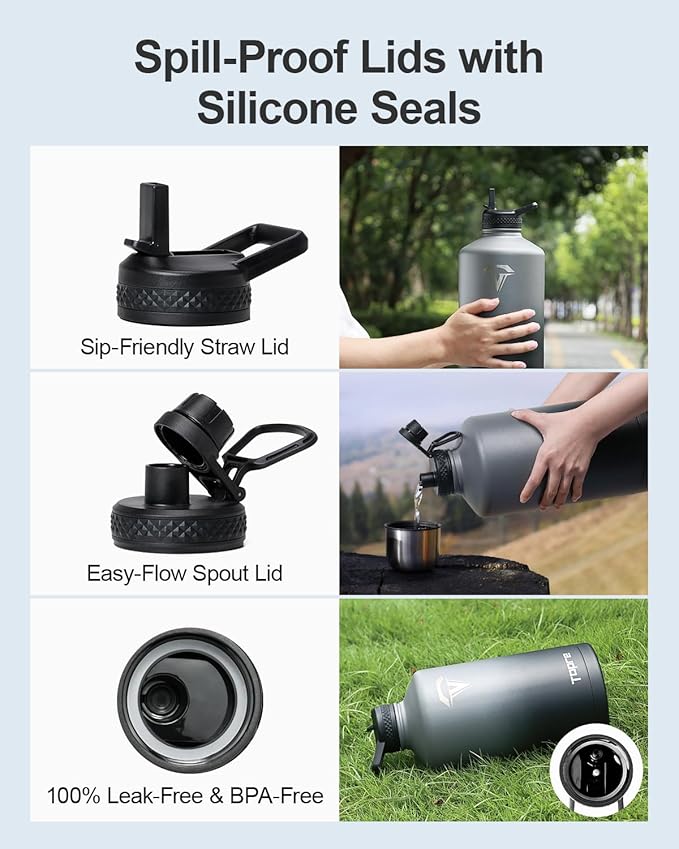 - No Leaks, No Worries: This stainless steel water bottle ncludes two leak-proof lidsβa straw lid and a spout lid. Both are equipped with silicone rings to prevent any spills or leaks, and are completely BPA-free for your peace of mind.