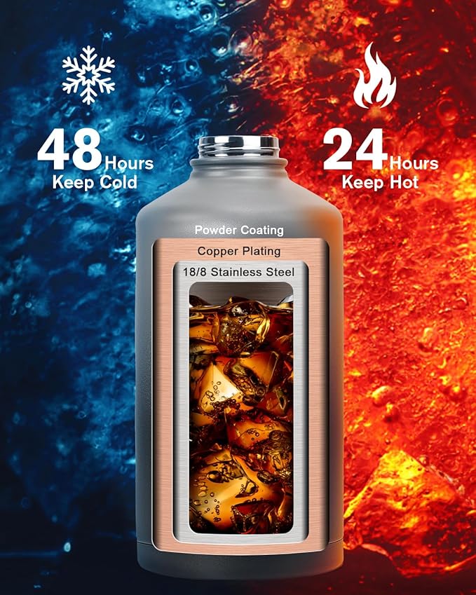 - Cold for 48H & Hot for 24H:Topre 128 oz One Gallon Insulated Water Bottle features advanced triple-wall vacuum insulation with copper plating, the water flask preserve the freshness and temperature of your drinks throughout the day.
