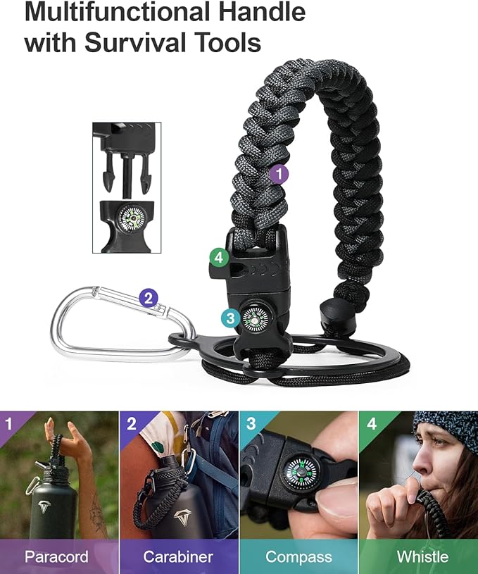 - Ready for adventures: The paracord handle is crafted from sturdy braided rope with an attached survival kit. This includes a compass, a whistle, and a clip, making it an ideal companion for any outdoor activity β be it camping,hiking or exploring new places through travelling.