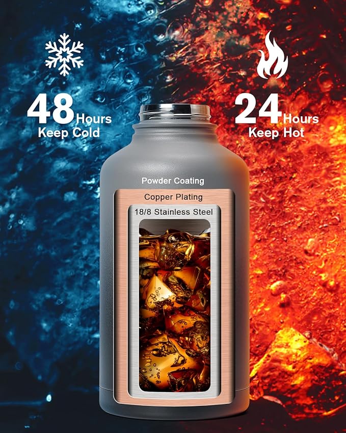 - Cold for 48H & Hot for 24H:Topre 64 oz Half Gallon Insulated Water Bottle features advanced triple-wall vacuum insulation with copper plating, the water flask preserve the freshness and temperature of your drinks throughout the day.