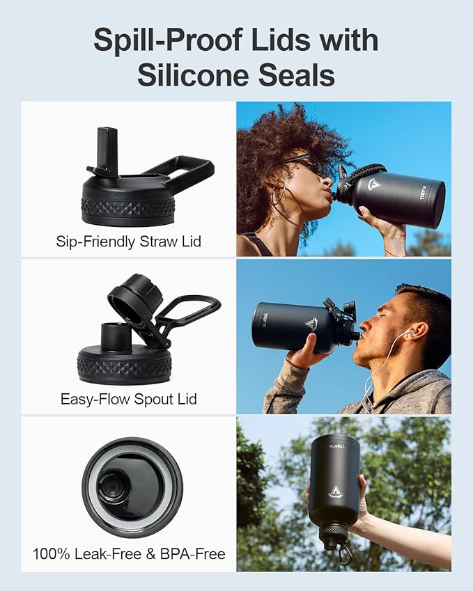 - No Leaks, No Worries: This stainless steel water bottle ncludes two leak-proof lidsβa straw lid and a spout lid. Both are equipped with silicone rings to prevent any spills or leaks, and are completely BPA-free for your peace of mind.
