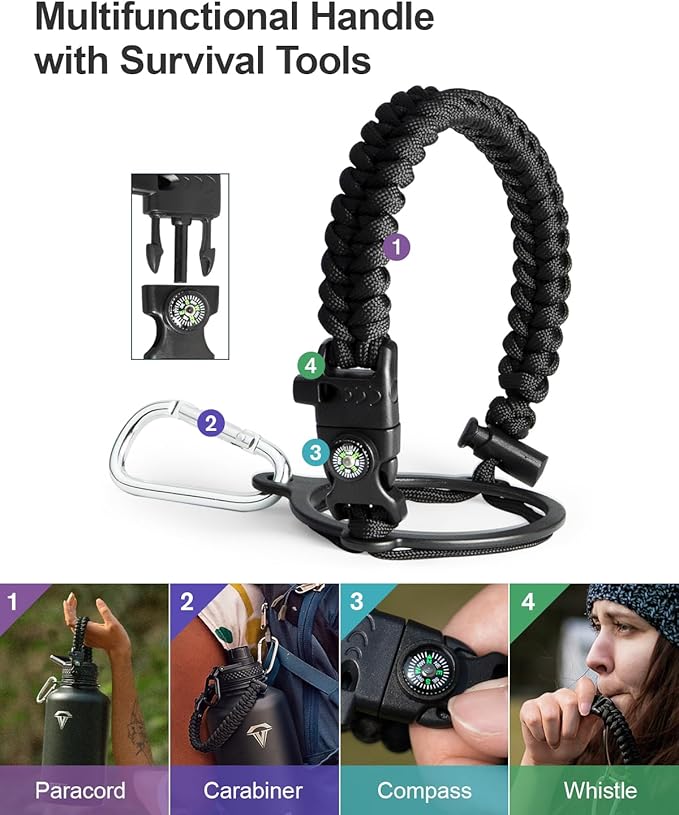 - Ready for adventures: The paracord handle is crafted from sturdy braided rope with an attached survival kit. This includes a compass, a whistle, and a clip, making it an ideal companion for any outdoor activity β be it camping,hiking or exploring new places through travelling.
