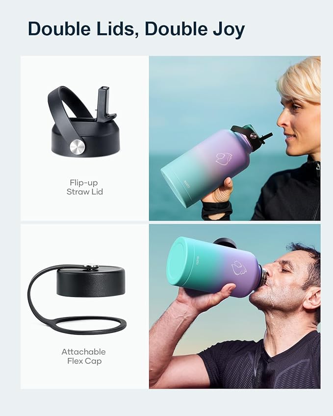- 2 Lids to Max Its Usability: This stainless steel bottle comes with a straw lid and a flex cap to gear up your games and explorations. Both caps can seal airtight with 100% leak-proof, so you can drink without a spill on the road. *NOTE: ONLY the 22oz and 32oz T-shape bottles fit in any cup-holders*