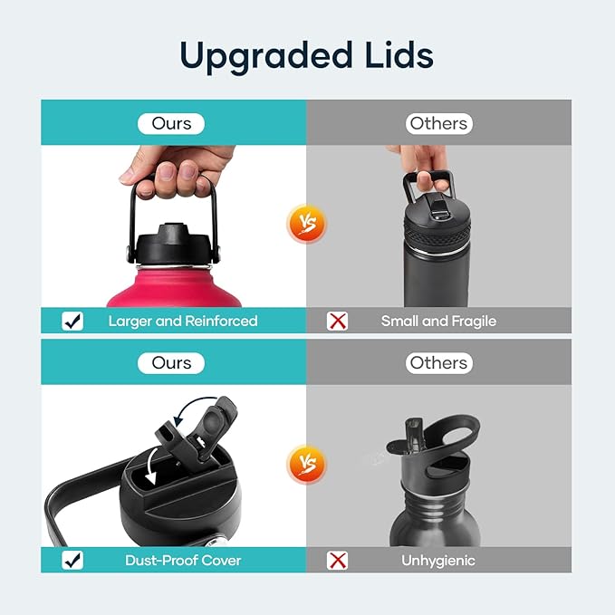 - 2 Lids to Max Its Usability: This stainless steel bottle comes with a straw lid and a flex cap to gear up your games and explorations. Both caps can seal airtight with 100% leak-proof, so you can drink without a spill on the road. *NOTE: ONLY the 22oz and 32oz T-shape bottles fit in any cup-holders*
