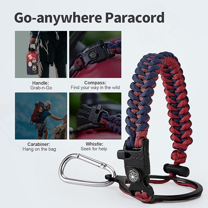 - Palm Fitting Paracord Handle: Compared to handle lids, nylon paracord on the bottle gives you more choices in terms of color coordination and coziness on your hands. Match the handle with your bottle to make a complete outdoorsy look. Compass and carabiner can be lifesavers for hiking and other expeditions
