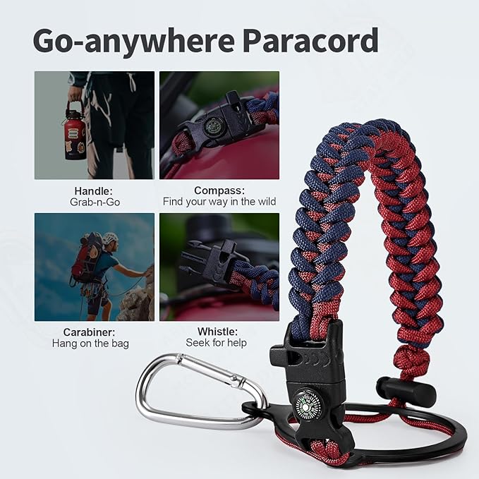 - Palm Fitting Paracord Handle: Compared to handle lids, nylon paracord on the bottle gives you more choices in terms of color coordination and coziness on your hands. Match the handle with your bottle to make a complete outdoorsy look. Compass and carabiner can be lifesavers for hiking and other expeditions