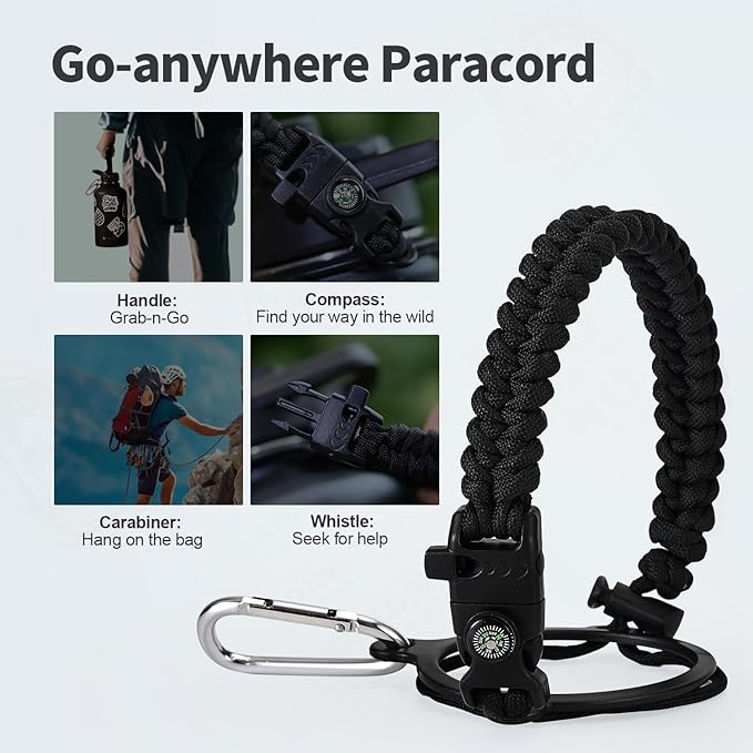 - Palm Fitting Paracord Handle: Compared to handle lids, nylon paracord on the bottle gives you more choices in terms of color coordination and coziness on your hands. Match the handle with your bottle to make a complete outdoorsy look. Compass and carabiner can be lifesavers for hiking and other expeditions
