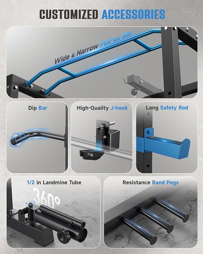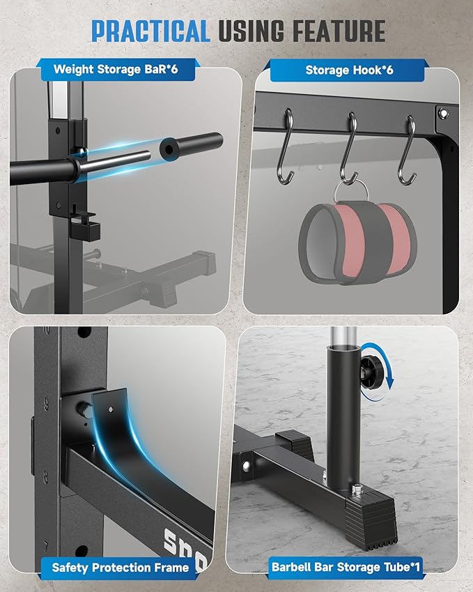 - 【Practical Using Feature】Say goodbye to a cluttered floor. Sportsroyals power rack for home gym is built with 1 barbell bar storage holder, 6 weight storage racks, and 6 handle storage hooks, it can perfectly organize all your gym accessories and weight plates. In addition, the rubber pads on the safety frame and safety rod can provide